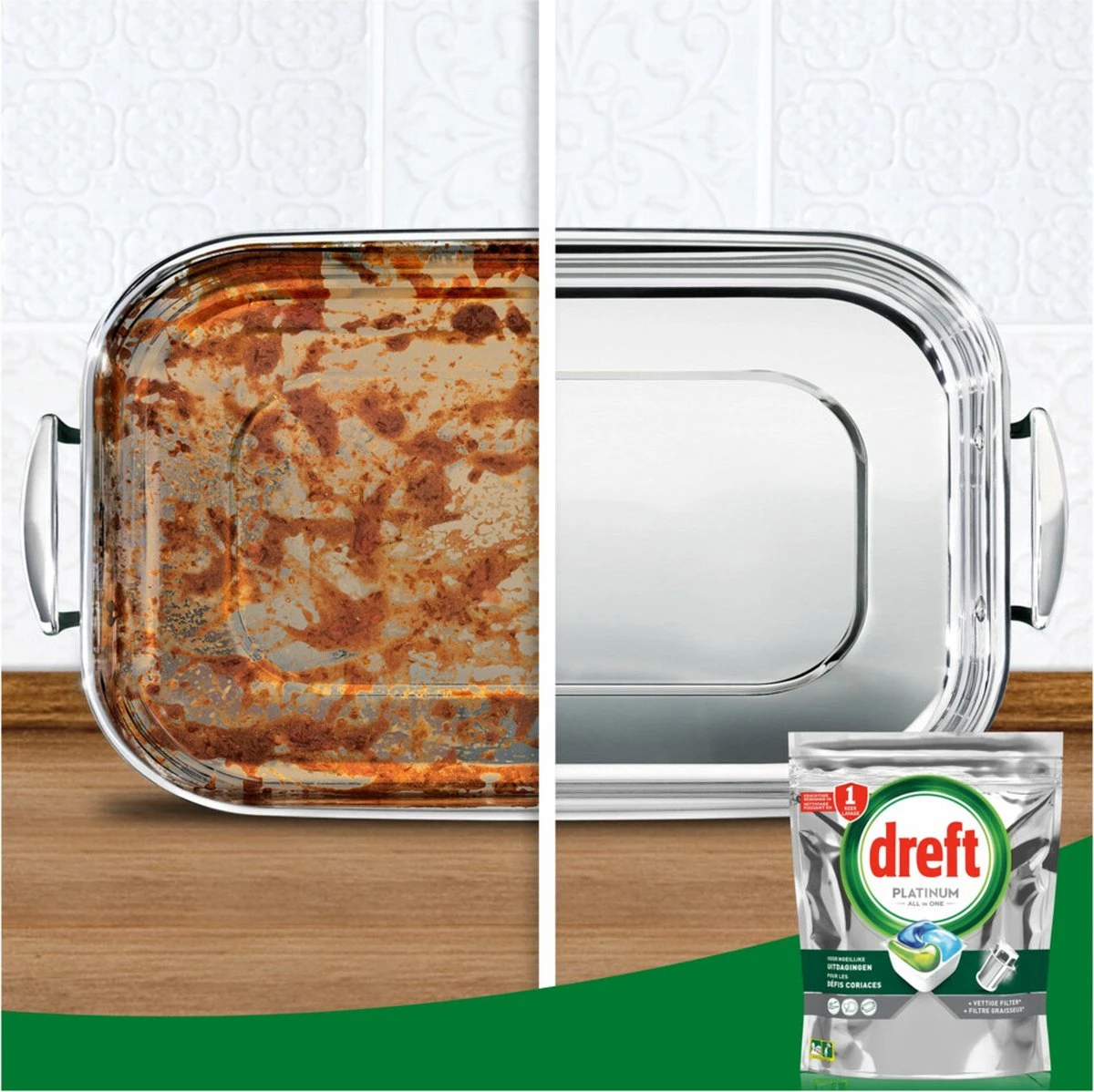 De Dreft Platinum All in One vaatwascapsules leveren een grondige reinigingsactie en reinigen zelfs de hardnekkigste vlekken om je vaat te laten schitteren. Dankzij de reinigingskracht van Dreft Platinum kun je in alle vertrouwen koken wat je wilt, want het haalt zelfs het vet uit je filter, voor een schone vaat en een frisse vaatwasser. Dreft combineert vloeistof en poeder in één krachtige capsule. Het ultra-oplosbare zakje lost snel op, zodat het snel begint te reinigen om de klus klaar te krijgen. En ze zijn gemakkelijk te gebruiken. Plaats ze gewoon in het doseerbakje van je vaatwasser, met verpakking.