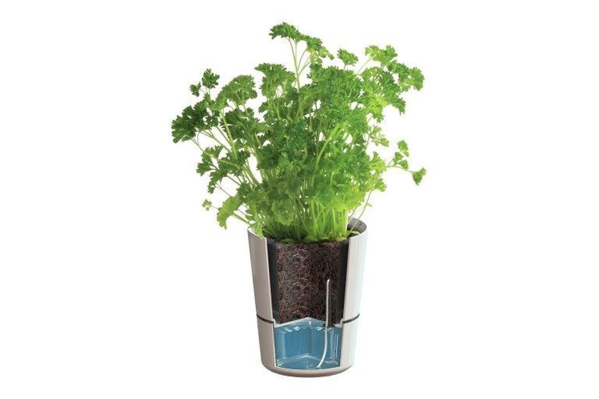 Kruidenpot Twin in de kleur wit. Voor de finishing touch van een heerlijke maaltijd, maar ook voor het beetje extra op een broodje kaas zijn verse kruiden onmisbaar. Daarom bracht Mepal een paar jaar geleden de kruidenpotjes op de markt, waarmee smaakmakers als basilicum, peterselie, bieslook en munt perfect in de keuken kunnen worden bewaard. In navolging van de kruidenpotjes is er nu de kruidenpot Twin: een grotere variant die plek biedt aan twee verschillende verse kruiden of andere plantjes. De potjes zien er fraai uit en delen samen een waterreservoir, waarmee wordt voorkomen dat de kruiden uitdrogen. De plantjes nemen via een katoenen hydrokoordje namelijk precies de hoeveelheid water op die ze nodig hebben. Ook praktisch: het grote waterreservoir heeft een inhoud van maar liefst 1 liter en hoeft maar één tot twee keer per week te worden bijgevuld. De Twin kruidenpot voor verse kruiden wordt standaard geleverd met 2 pinnetjes met koordjes en deze onderdelen kunnen bovendien eenvoudig worden bijbesteld. Dat is pas duurzaam!