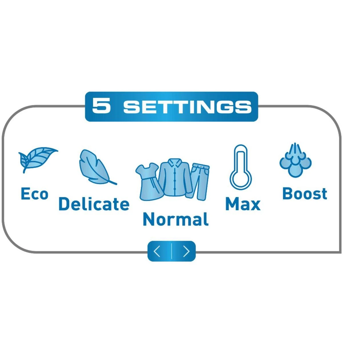 Zeer gebruiksvriendelijk bedieningspaneel met 5 voorgeprogrammeerde functies voor de perfecte combinatie van hoeveelheid stoom en temperatuur per textielsoort